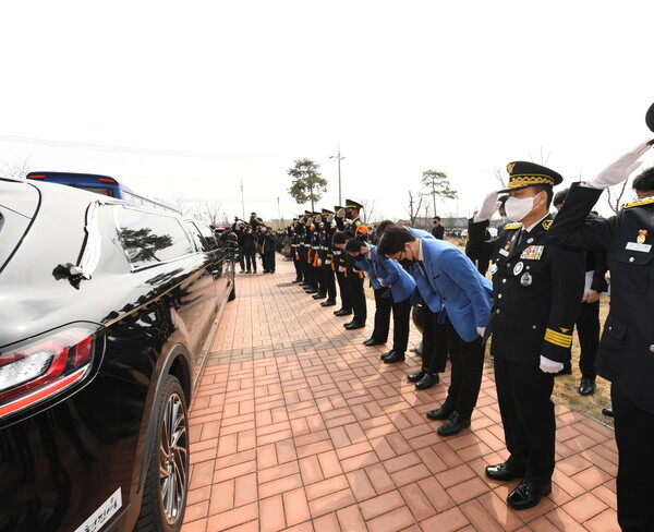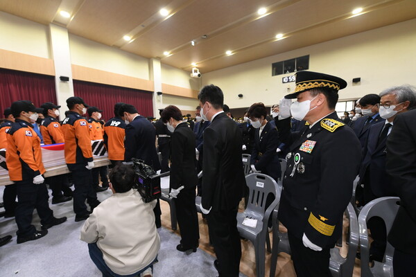 남화영 소방청장 직대는 9일 오전 전북 김제시 국립청소년농생명센터에 마련된 김제 화재 현장서 순직한 故성공일 소방공무원 영결식을 거행했다. 영결식은 전라북도장으로 엄수됐으며, 유가족과 내·외빈 동료 소방관 등 500여명이 참석했다. 고인은 국립대전현충원에 안장돼 영면한다.[자료 제공 소방청]
