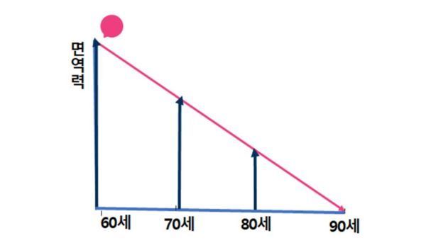 필자 : "현재 58세인데 90세까지 산다고 가정하면, 60에서 70, 80, 90세로 나이가 들면서 체력은 점점 감퇴하는데, 그래프와 같이 나이가 들면서 예방접종에 대한 신체 면역체 형성 반응도 점점 떨어집니다. 이해 되나요?"